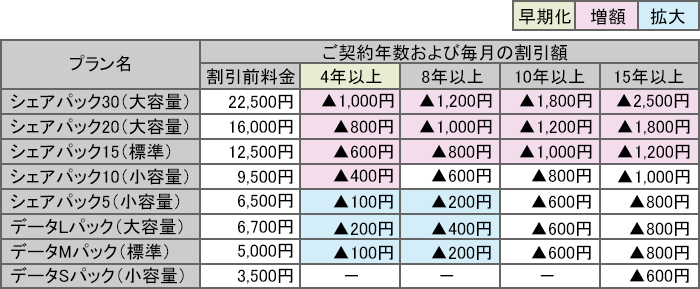 | 割引適用範囲の拡大 | 割引適用10年以上 (シェア5、Mパック、Lパック) | 割引適用4年、8年以上 |