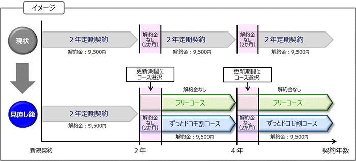 なお、現在は更新期間は2年定期契約満了月の翌月、翌々月の2か月間となっているほか、フリーコースからずっとドコモ割コースへはいつでも変更可能。法人契約は対象外。