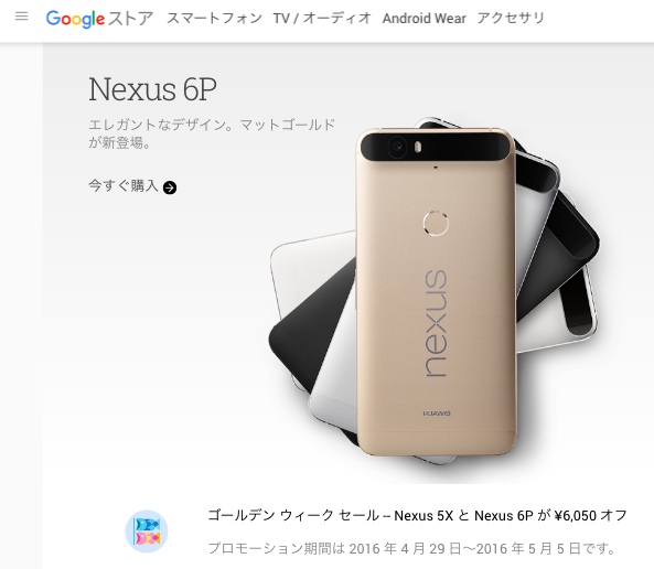 Google Japan(グーグル)の公式Webストア「Google ストア」( https://store.google.com )にてスマートフォン(スマホ)「Nexus 6P」および「Nexus 5X」がゴールデン ウィーク セールで6,050円割り引かれています。