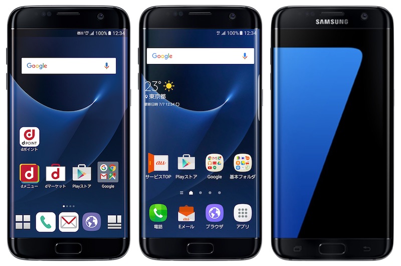 先行して発表されたau向けGalaxy S7 edge SCV33やグローバル向けとの違いでは、外観が前面にグローバル向けのみ「SAMSUNG」ロゴがあり、背面中央にグローバル向けは「SAMSUNG」ロゴ、NTTドコモ向けは「docomo」ロゴ、au向けは「Galaxy」ロゴ、背面下部にNTTドコモ向けは「Galaxy」ロゴ、au向けは「au」ロゴがあるほか、NTTドコモとauにはFelicaやQiのマークも記載されています。