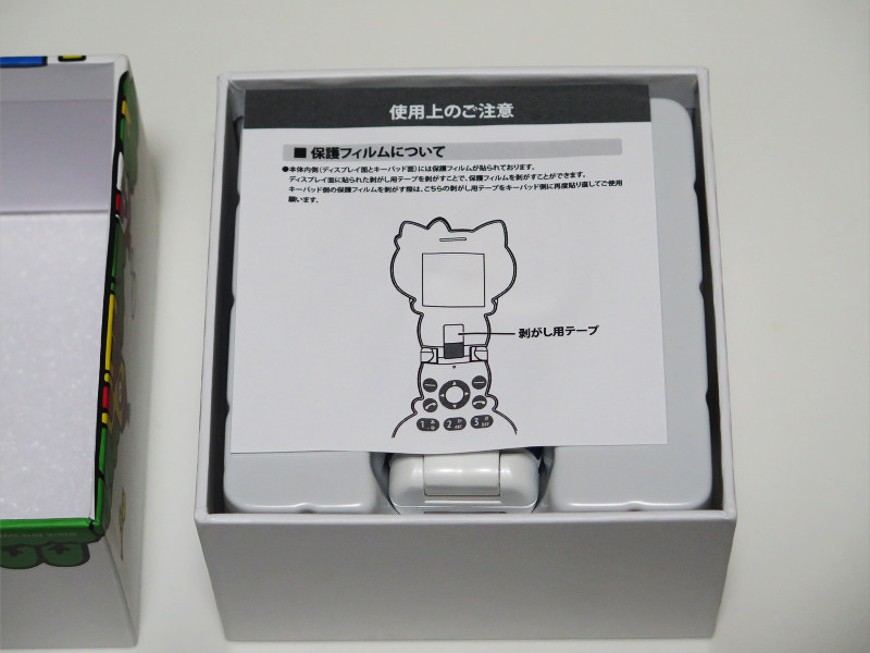 ハローキティフォン本体に貼られている液晶保護シートに関する注意書きの紙
