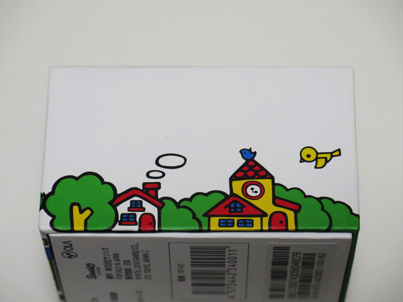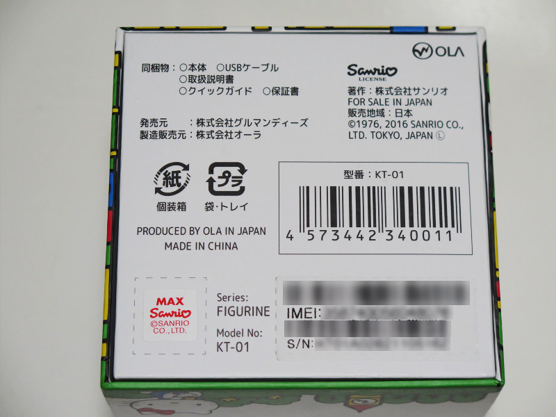 それでは、ハローキティフォンの箱をさっそく開封してみましょう。個装箱正面にはハローキティフォンを手に持ったキティちゃんが大きく描かれています。また、背面にはシリアルナンバーや端末識別番号(IMEI)の印刷されたシールが貼られていました。