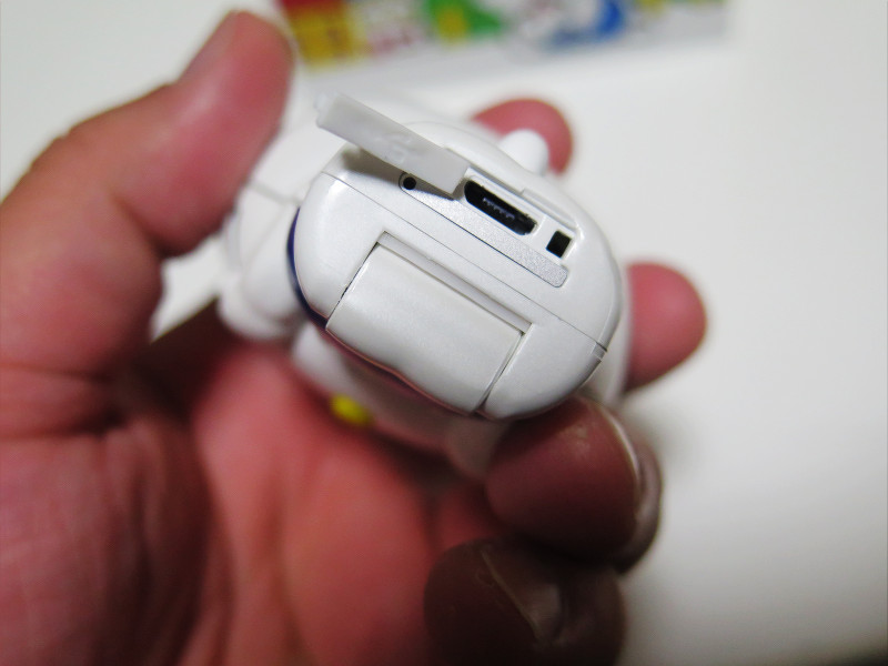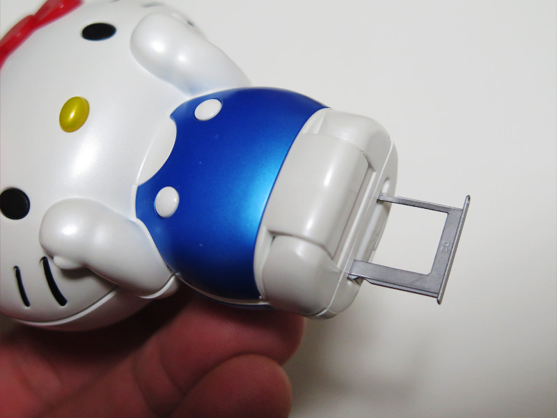 少しわかりにくいかもしれませんが、microUSB端子のカバーとSIMカードスロットはキティちゃんの足の裏にあります。SIMカードはmicroSIMカード(3FF)サイズで、SIMカードスロットは引き出すタイプです。
