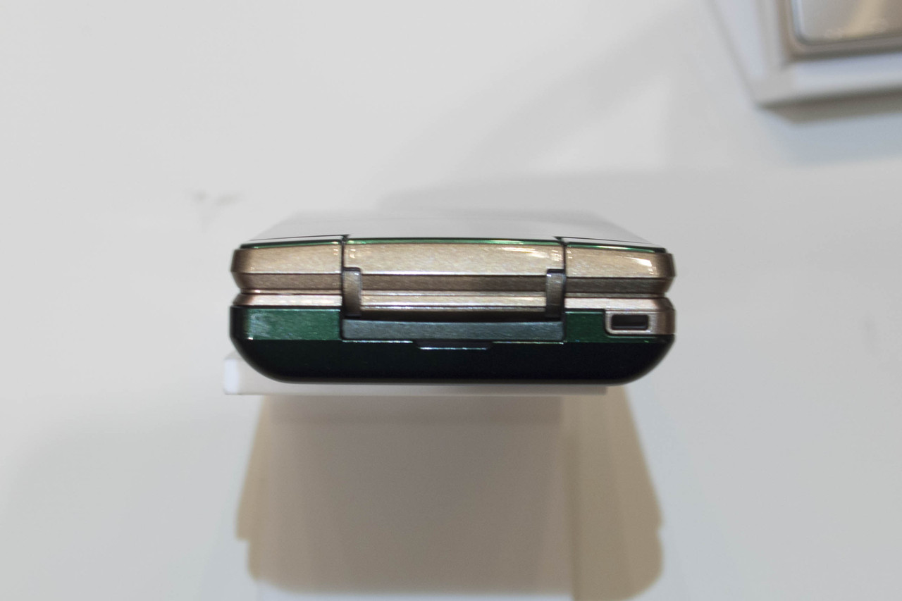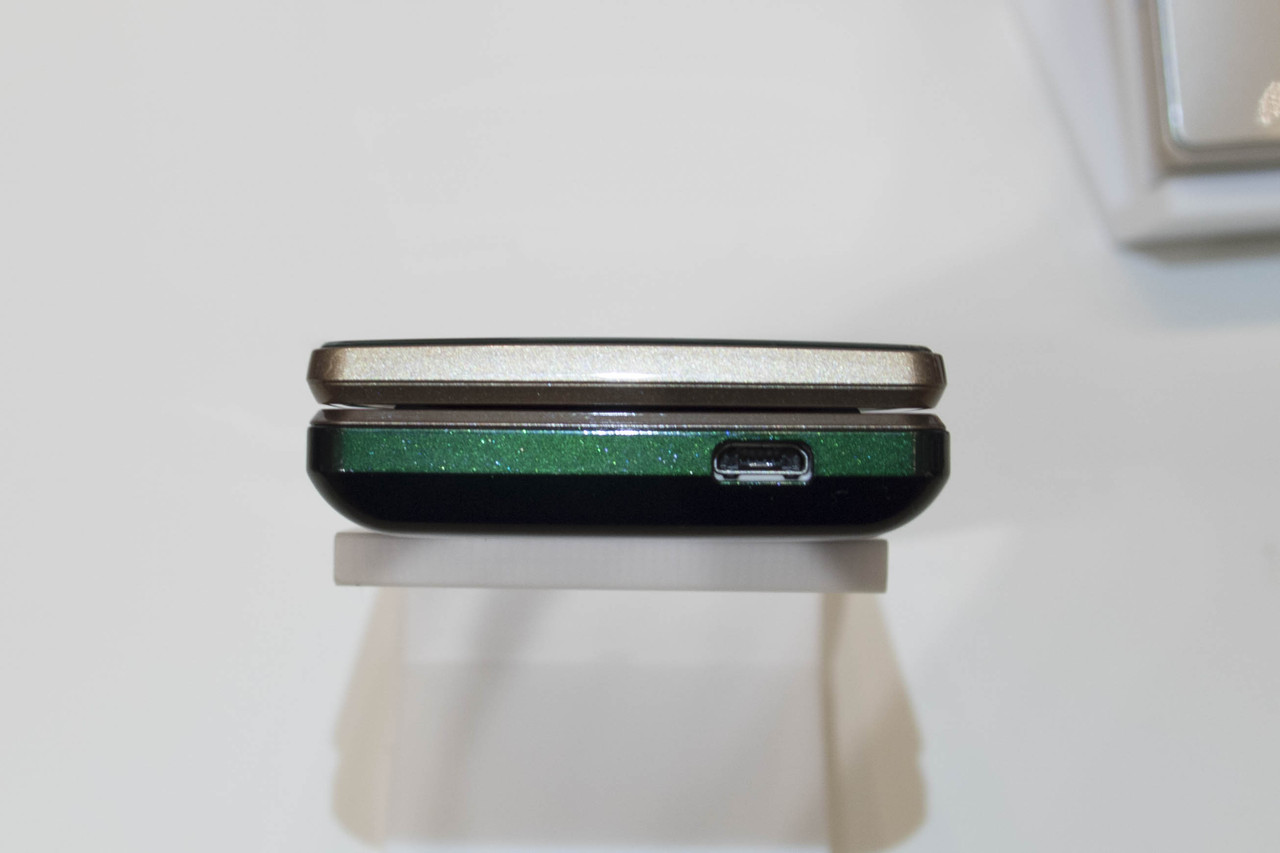 開いたときの本体下側には充電や外部接続のためのmicroUSB端子があります。また、ヒンジ部にはストラップホールが配置。