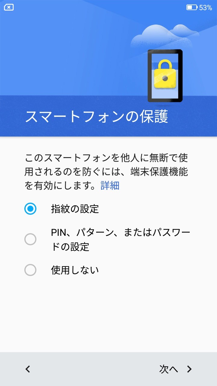 指紋認証の設定は初期設定の途中に出てくるほか、後で「設定」→「セキュリティ」→「指紋」から行なうことができ、今回は設定から行っています。設定方法は他の機種と同じように指紋を登録する際に指を少しずらしたりと案内に従って登録するだけ。