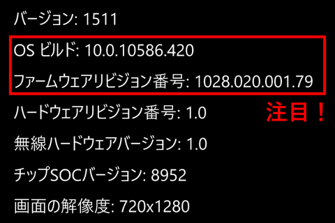 アップデート後のファームウェアバージョンは1028.020.001.79、OSのバージョンは10.0.10586.318でした。初期設定後一晩放置したところ、さらにOSの更新が来ていて、アップデート後に10.0.10586.420になりました。