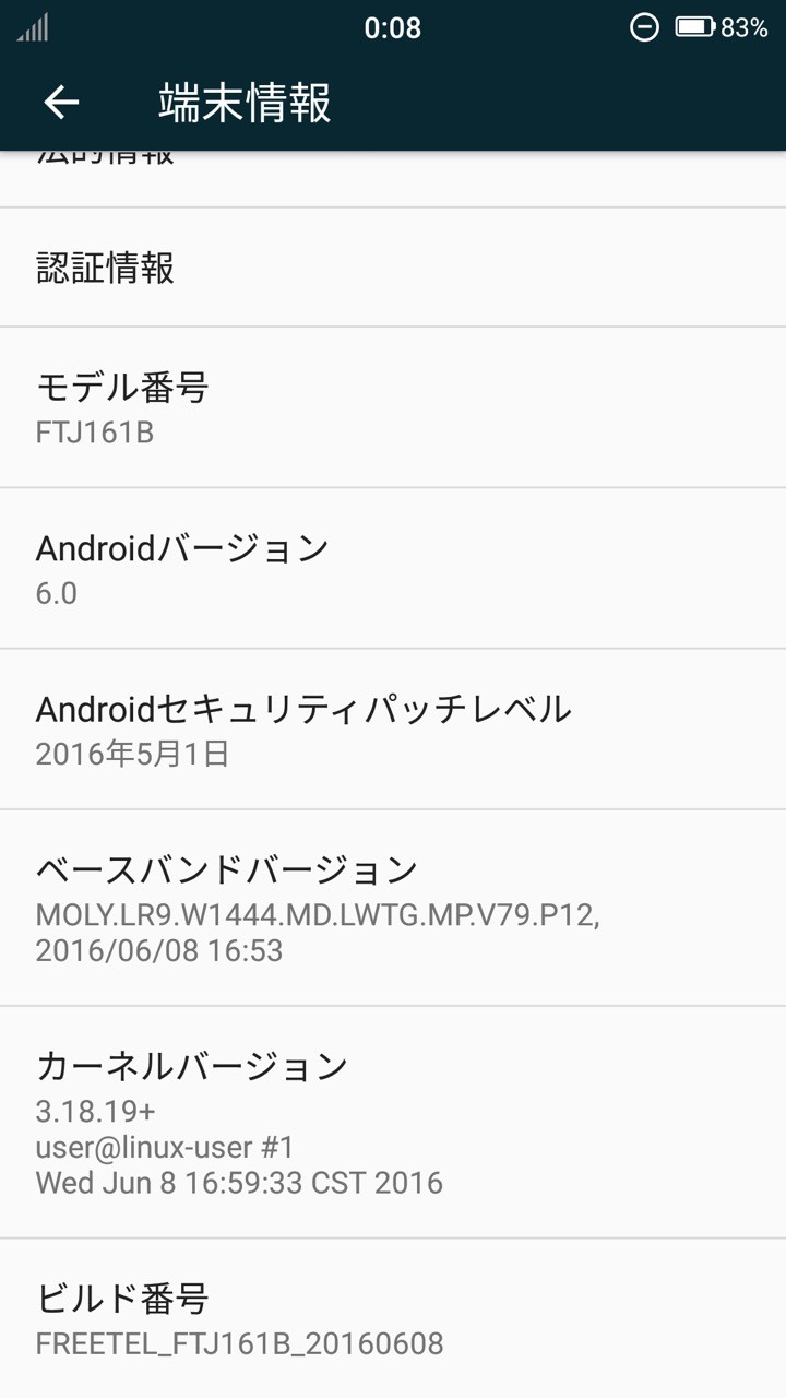対象はビルド番号「freetel_FTJ161B_20160512」で、更新後はビルド番号「freetel_FTJ161B_20160608」になります。なお、ビルド番号は「設定」>「端末情報」をタッチし、最下部にて確認可能。