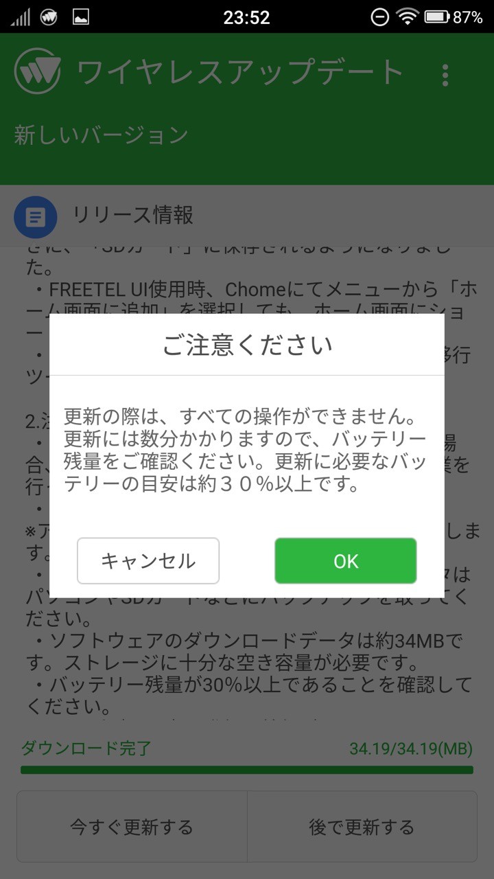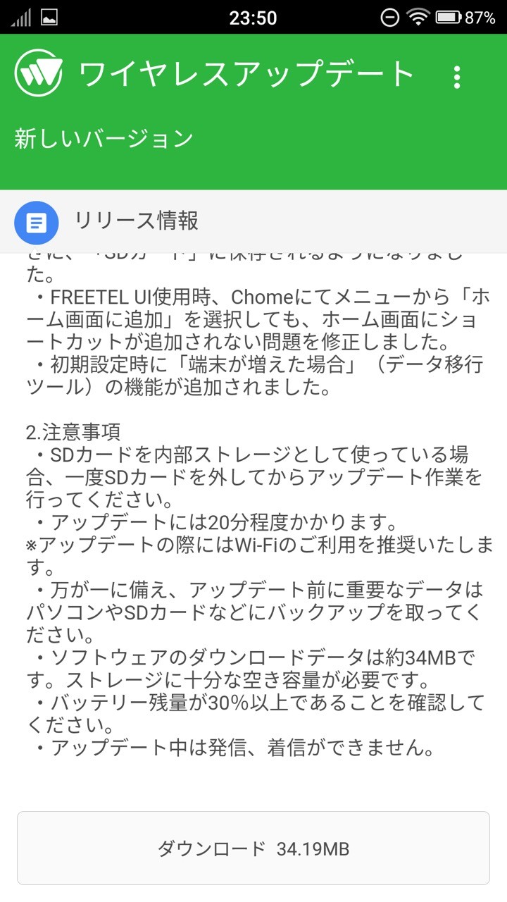 なお、ソフトウェア更新に失敗し操作ができなくなった場合は、FREETELのカスタマーサポート( https://www.freetel.jp/support/ )まで問い合わせるように案内しています。その他、更新に再する注意点は以下の通り。