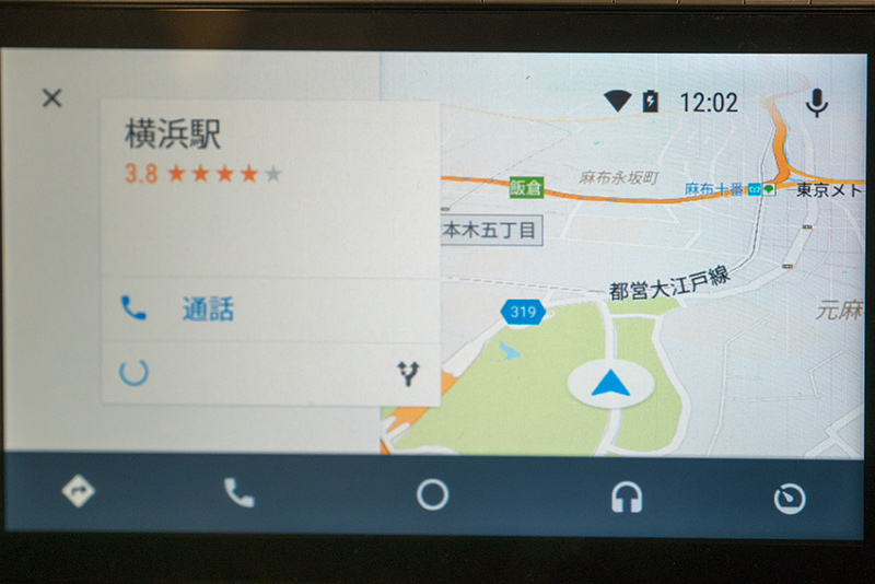 また画面下には、Googleマップによるナビ、電話、ホーム、ミュージックプレイヤー、サードパーティアプリ(カーナビメーカー、自動車メーカーが搭載するアプリ)の5つのボタンが並ぶ。