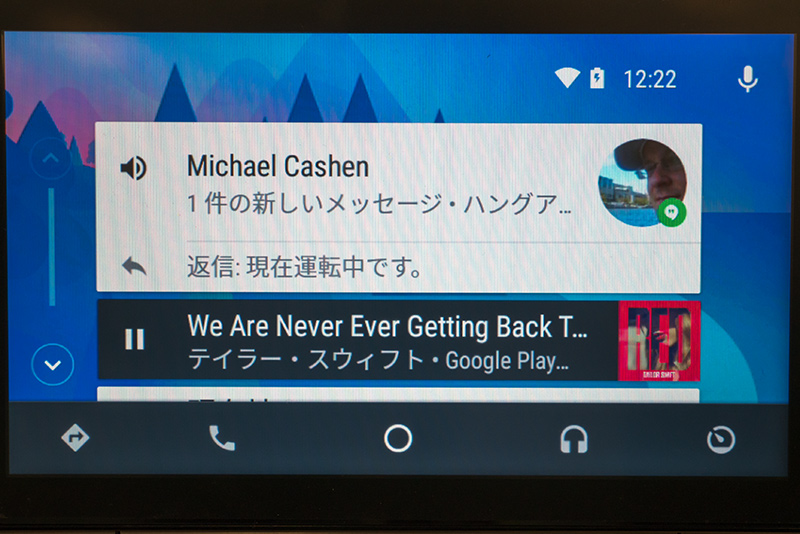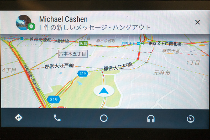 ナビ中にGoogleのメッセンジャーアプリ「ハングアウト」宛てにメッセージが届くと、音声で読み上げてくれる。またその場で、音声で返信することも可能だ。