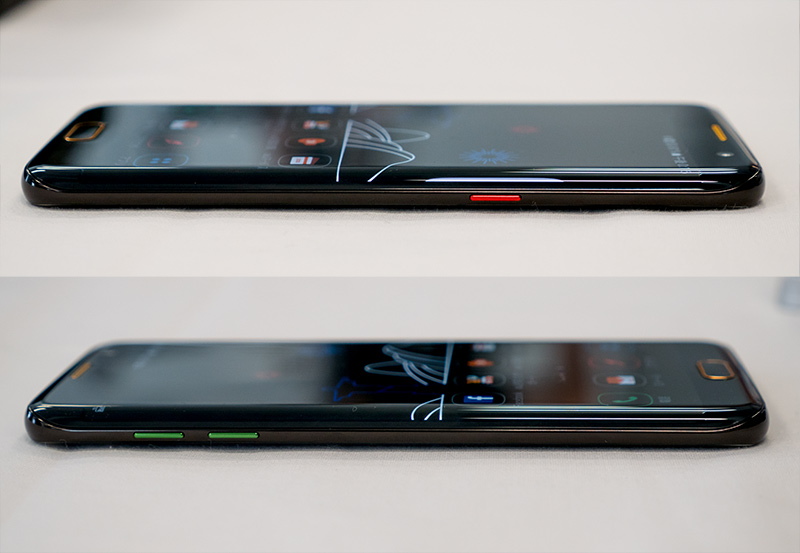 右側面(写真=上)には赤い電源キー、左側面(写真=下)には緑のボリュームキーがある。