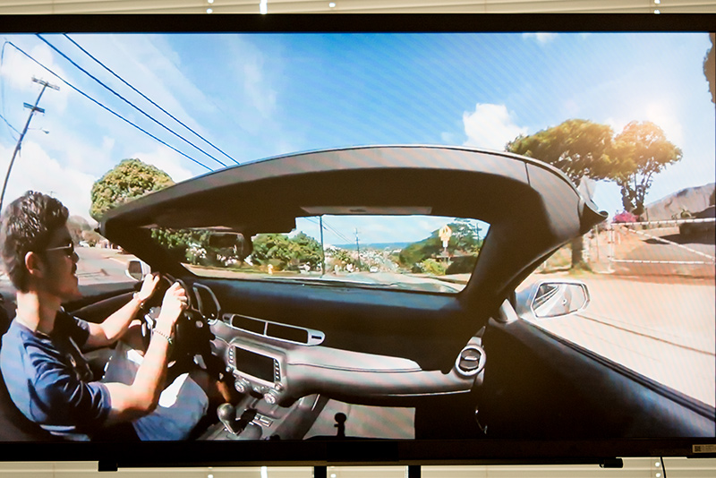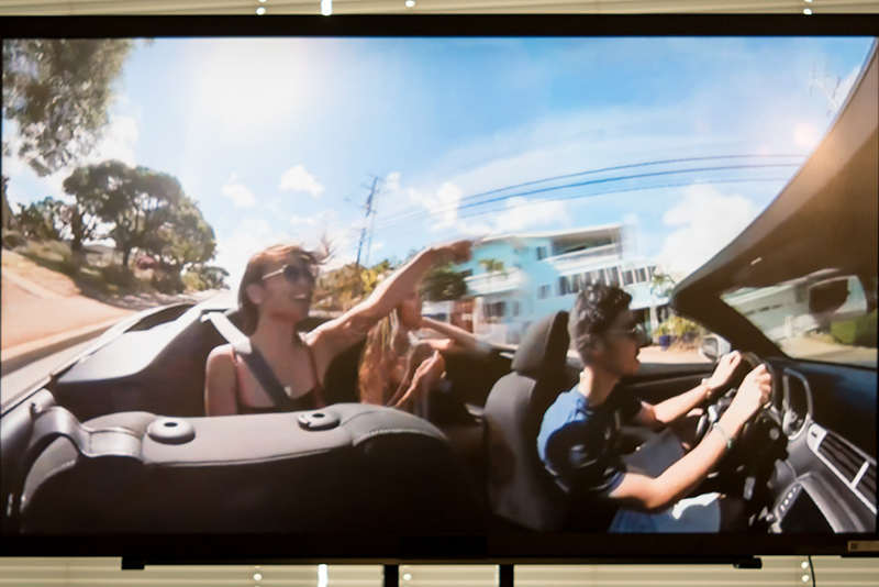 紹介されたGear 360のサンプル動画は、仲間と一緒にドライブをしているかのような助手席からの映像で、振り向くと後部座席で楽しんでいるようすが分かるというもの。