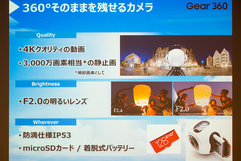 良い映像で思い出を残すためにGear 360の、4Kクオリティの動画撮影と3000万画素相当の静止画撮影(360°撮影)と、F2.0の明るいレンズ、多少の水濡れでも撮影できるIPS53等級の防滴仕様を紹介。また、microSDカードとバッテリー交換を可能とし長時間の撮影に対応する。
