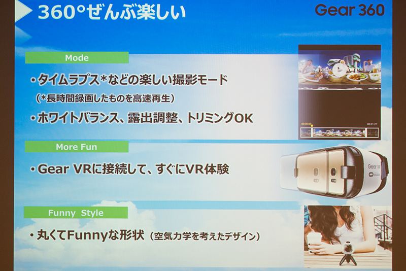 また、Gear VR向けコンテンツはCP(コンテンツプロバイダー)によるものだが、「Gear 360が世に出ることで、みなさんの思い出を共有できる世界が実現する」とアピールした。
