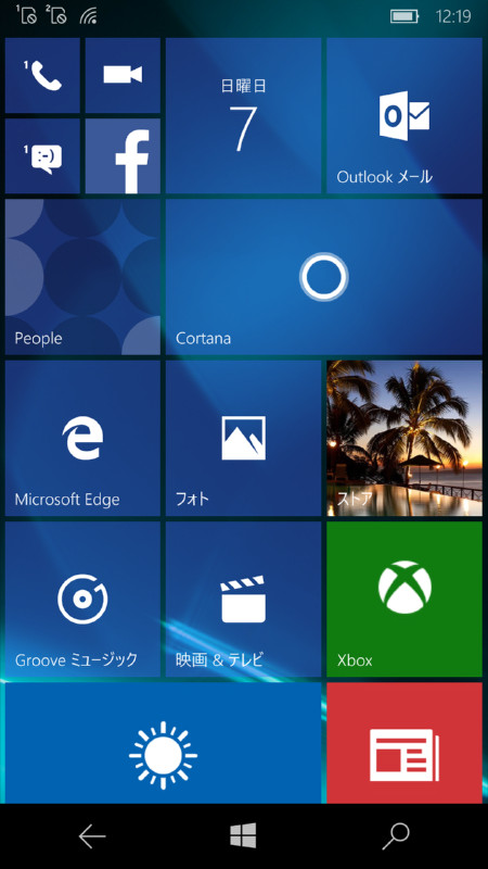 ホーム画面(Windows 10 Mobileでは「スタート画面」)はサードパーティー製のアプリで初めから配置されているのが「Facebook」アプリのみで、その他はWindows 10 Mobileの開発元であるMicrosoftの標準的なアプリが並んでいます。また、音声アシスタント「Cortana」のアイコンの大きさが目を引きます。