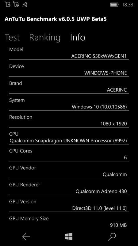 チップセットのQualcomm製ヘキサコアCPU「Snapdragon 808」はAndroidでは昨夏くらいから昨年後半にかけて搭載された機種が多く、そういった意味ではそれらと同時期の少し前の最上位レベルのスマホクラスのスコアとなっており、現行のWindows 10 Mobileスマホとしては頭ひとつ抜けたマシンであることがわかりました。