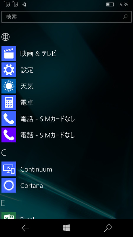 一方で、意外なことに約2100万画素もの高精細を誇る売りの1つになっているはずの「カメラ」のアプリや現時点では国内唯一の有線接続対応であるCointinuum for Phoneのアプリアイコンはスタート画面にはありません。もちろん、これらはスタート画面を横にスワイプして表示できる「アプリ一覧」にはあるので、必要であればスタート画面に設置すればOKです。