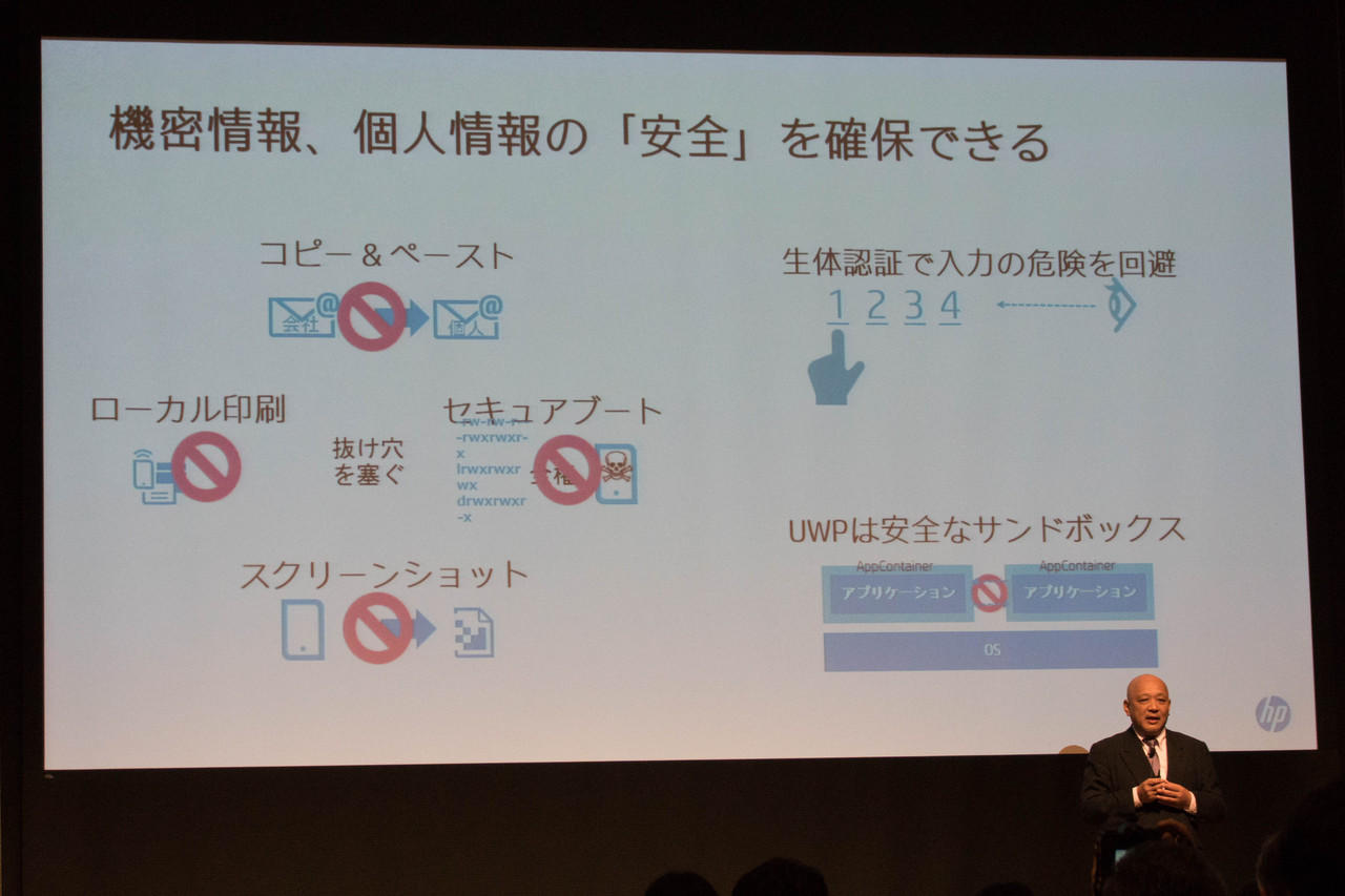 また、セキュリティー面についてもHP Elite x3は指紋認証と虹彩認証の両方に対応し、コピー&ペーストやスクリーンショットを禁止しての情報流出防止、セキュアブートやアプリケーションに用いられるUWPのサンドボックスにより、ソフトウェアの改変を防ぐことで万全を期しているとのこと。