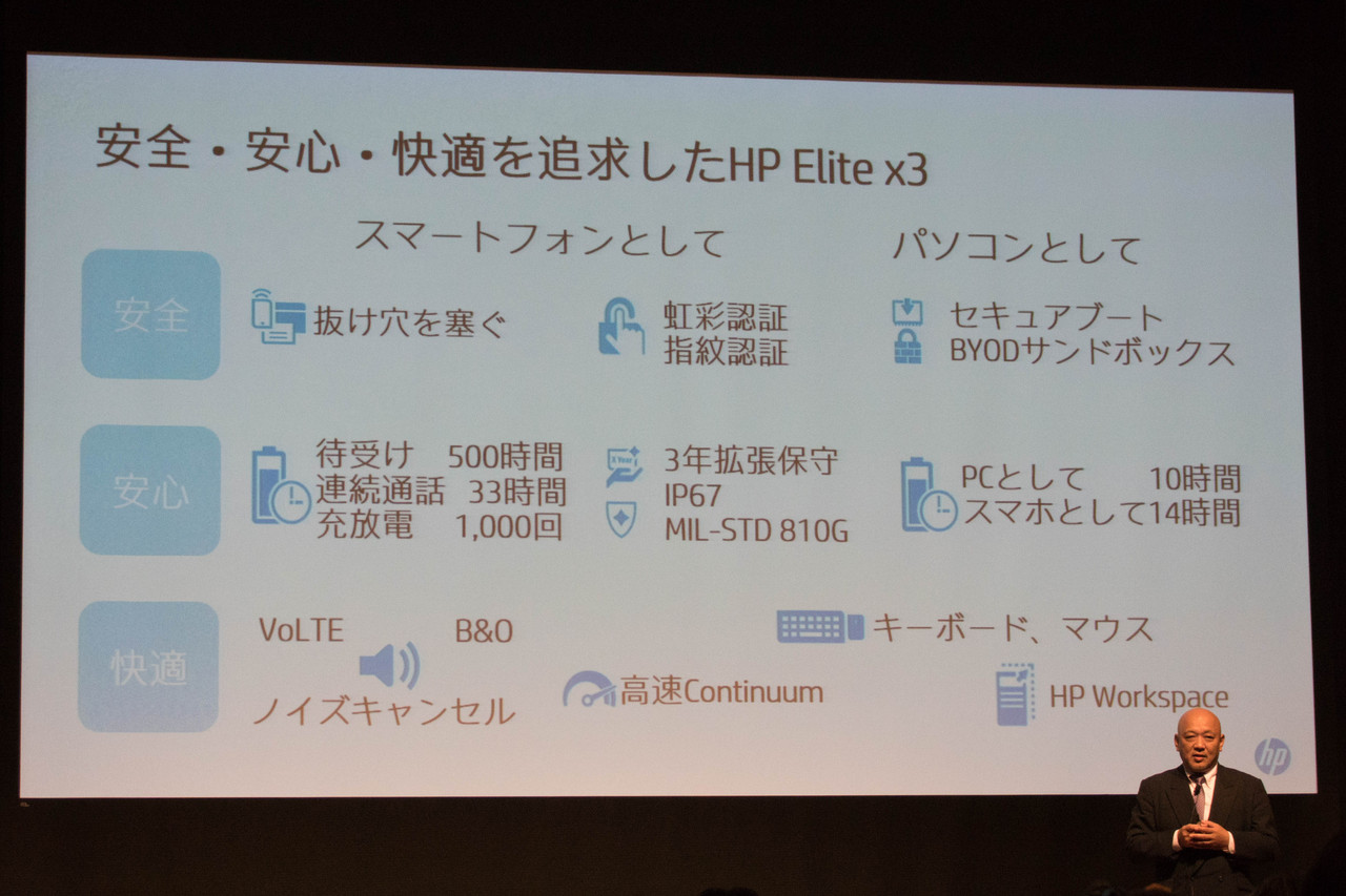 その他にも、HP Elite x3はIP67水準の防水-防塵への対応、米軍も採用する「MIL-STD-810G」準拠の耐衝撃、Corning製「Corilla Class 4」をディスプレイガラスに採用するなど、堅牢なハードウェアであることも説明されました。