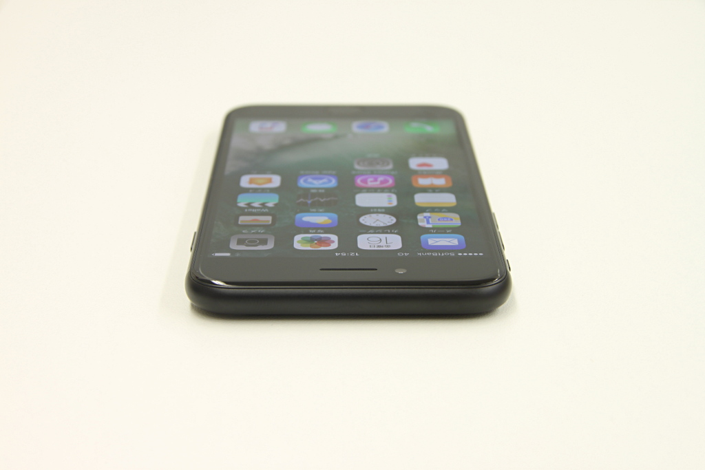一方、背面はカメラが大きくなり、上下のアンテナが目立たなくなったことで、従来との違いがより明確です。iPhone 7といえば、艶ありブラックの新色「ジェットブラック」が何かと話題になりますが、今回入手したもう1つの新色ブラックは、ジェットブラックと対照的な艶消しに仕上げられており、上品で手触りの良い背面になっています。上下のアンテナはボディと同色で、よく見てようやく境目がわかるところまで一体に仕上げられています。