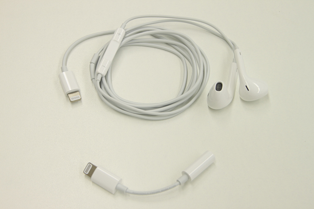 付属品はUSB電源アダプター、Lightningケーブル、Lightning接続のヘッドホン(EarPods)、Lightningにヘッドホンを接続するためのアダプター、マニュアル類です。