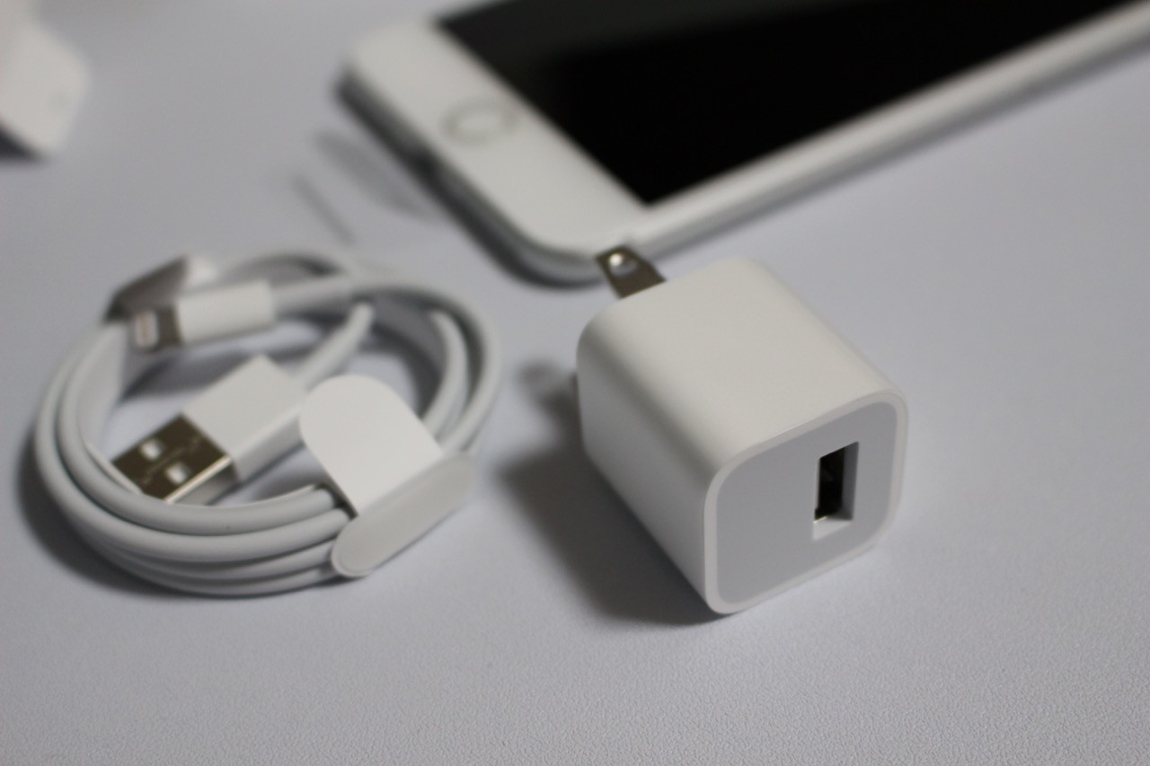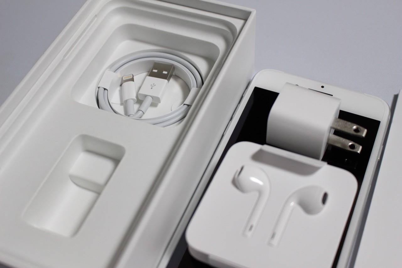 同梱物はiPhone 7 Plusの本体のほか、USB-ACアダプター、Lightning-USBケーブル、Lightning接続イヤホン、3.5mmイヤホンジャック-Lightning変換アダプター、SIMカードスロット用のピン(以下、SIMピン)、保証書、アップルロゴのシールなど。