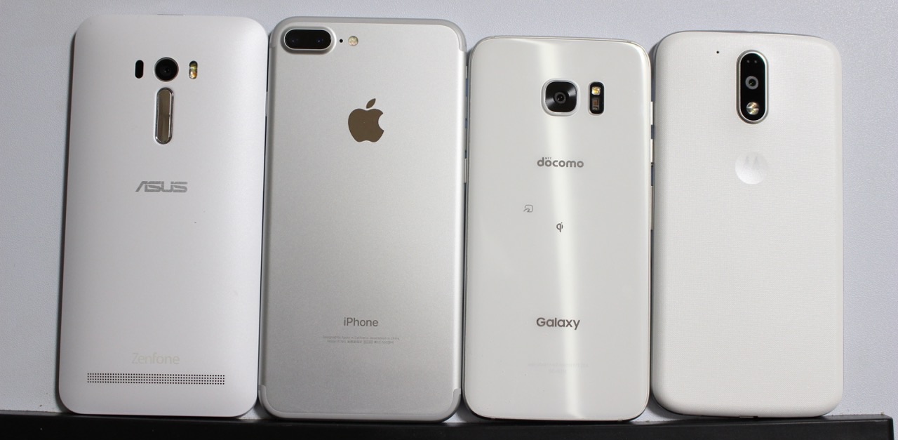 左からZenFone Selfie、iPhone 7 Plus、Galaxy S7 edge、Moto G4 Plusですべて同じ5.5インチサイズですが、Galaxy S7 edgeが小さいのがわかります