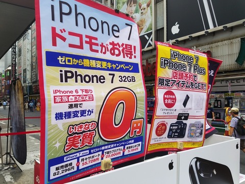 つまり、iPhone 7へ機種変更や他社から乗り換え(MNP)をしただけではいわゆる「実質0円」での購入はできないが、上記の写真のようにNTTドコモの携帯電話取扱店ではiPhone 7の32GBモデルが実質0円より購入できることをアピールされていた。