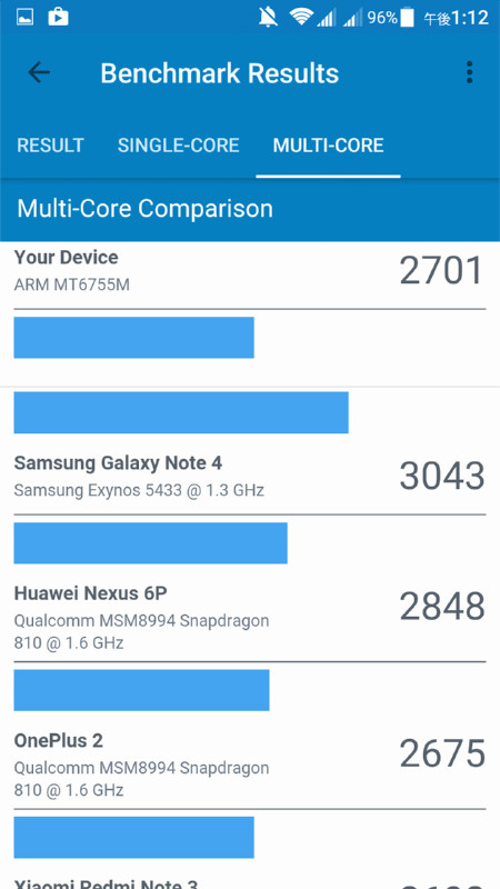 しかし、マルチコアでのスコアは2701点で「Nexus 6P」に迫るものとなっています。イメージとしては「高くないシングルコア性能をマルチコアでカバーしている」といったところでしょうか。実際に使ってみるとわかりますが、動作自体はかなり軽快で、動作のひっかかりは処理の重いゲームなどをしないかぎりはほぼありません。