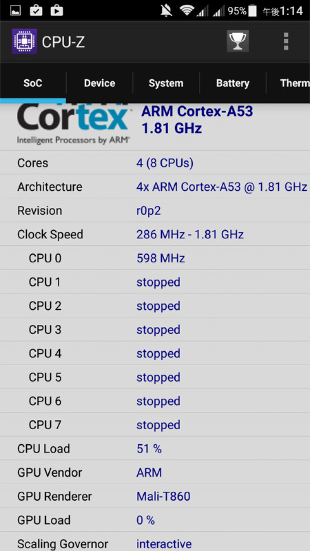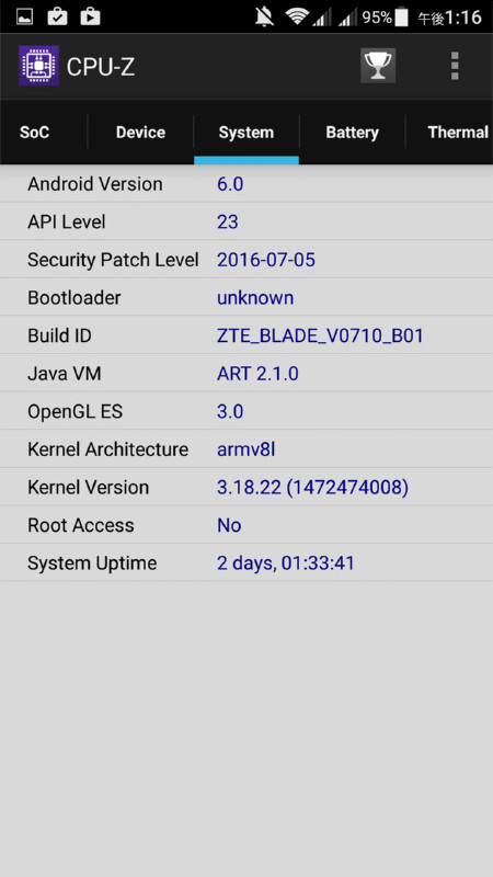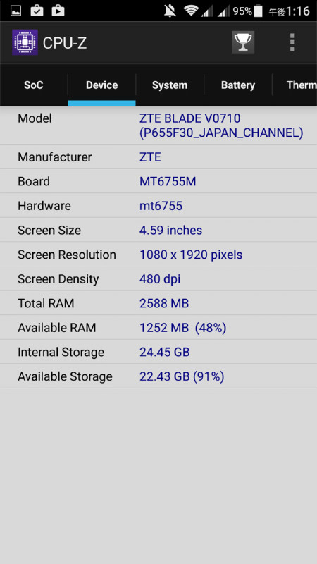 アプリ「CPU-Z」で取得した「ZTE BLADE V7 MAX」の基本スペック