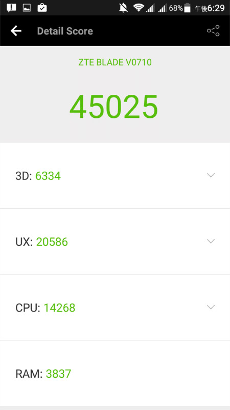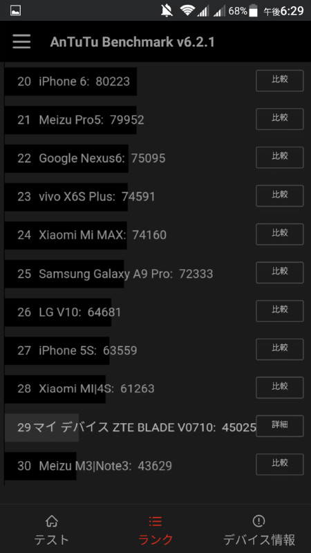 今回のAnTuTu Benchmarkでの計測スコアは45025点。ランク表記を見てもかなり下の方ですが、AnTuTu Benchmarkでは「Nexus 6」ですら75000点へようやく届くくらいの世界で、他のミドルレンジクラスもおおよそ同程度なのでこんなものかなと思います。