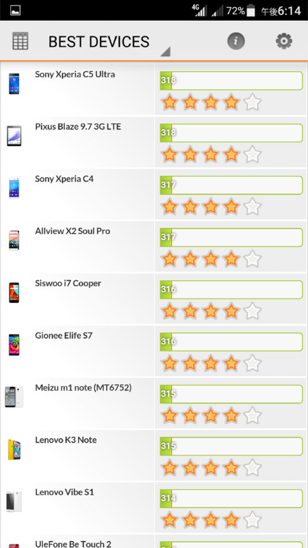 スコアの近い機種には「Xperia X」や「Xperia Z3 Tablet Compact」、「HUAWEI P8」の名前が見られます。これらは現行のミドルクラス、あるいは1〜2世代前のミドルハイレンジクラスの製品なのでこちらのスコアで見る総合力は健闘しているといったところでしょう。
