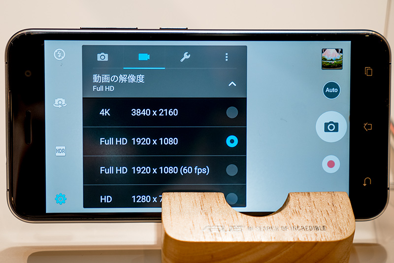 動画はZenFoneシリーズ初の4K UHD(3840×2160ドット)に対応する。高速オートフォーカスはもちろんだがコンティニュアスAFが期待できるのが動画機能だ。また、動画撮影時にはOISのほかにEIS(電子式手ブレ補正)も動作するため手ブレを抑えた滑らかな動画撮影が可能だった。