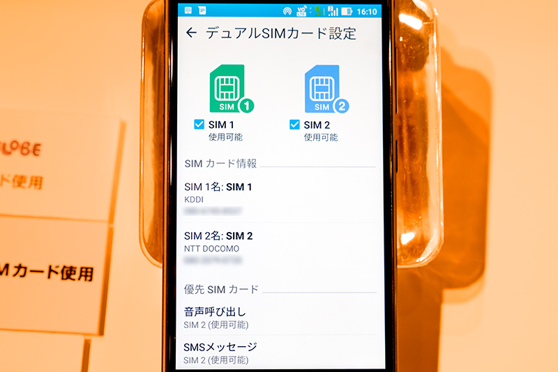 DSDSは3G・4Gによる同時待受が可能で、音声通話には「au VoLTE」に対応するなど日本向けのサポートも万全だ。デモ機にはau回線とNTTドコモ回線を使ったMVNOのSIMによる同時待受が可能な状態となっていた。