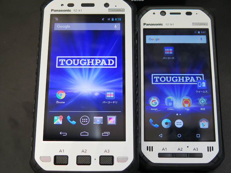 大きさは幅74mm×奥行156mm×厚み16.3mm(バーコードリーダー部は31mm)で本体重量は約275gとスマホとしてみると相当に重量級ですが、前モデルのFZ-E1やX1と比べると軽量・小型化し、高耐久のハンドヘルド機としては世界最軽量の製品となります。