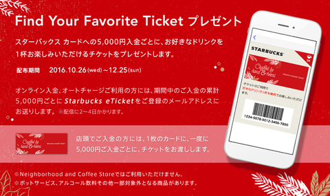 スターバックス・ジャパンは26日、同社のコーヒーチェーン店「スターバックス」において支払いに使えるプリペイド式カード「スターバックスカード」に5,000円入金するごとに好きなドリンクが1杯無料になるキャンペーンを2016年10月26日から12月25日まで開催するとお知らせしている。