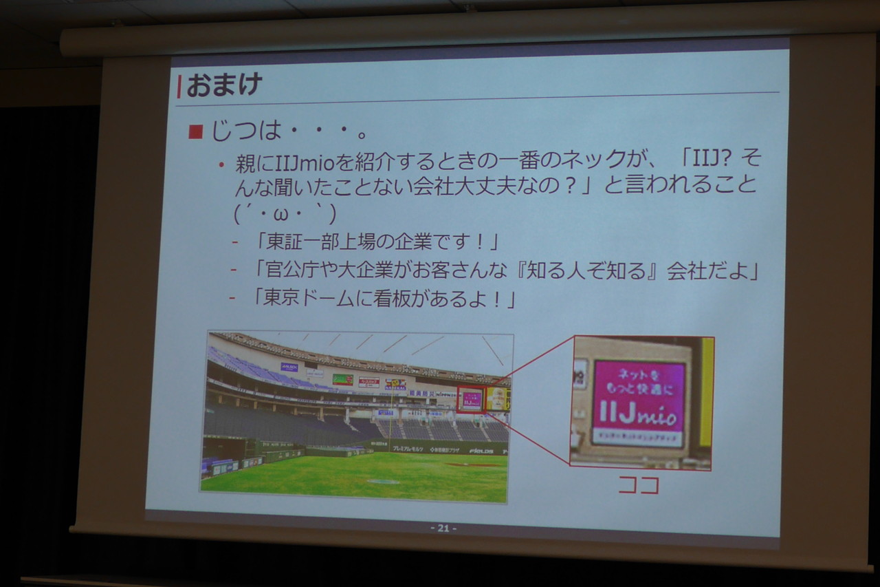 親世代にIIJと言っても残念ながら知名度はほぼ皆無でしょう。IIJ自身でもそう言う状況を自覚しているようで、「東証一部上場だよ!」や「東京ドームに看板があるよ!」など自社をアピールしていました。会場では大受けでしたが果たして親世代に通じるのか……。少し疑問にも感じます。
