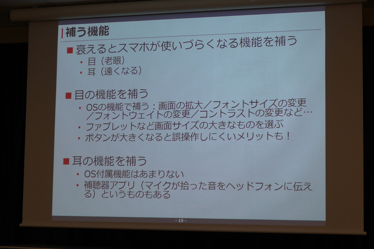 特に、中高年の年齢になってくると視覚や聴覚が衰え始めます。そのことを考えるとそれぞれを補う機能を使用することがおすすめだと紹介されました。スライドでは、その機能の一例が紹介されています。
