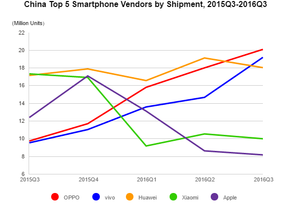 特に1位のOPPOと2位のvivoの成長が著しく、両社ともに前年第3四半期比で+100%以上の成長を見せています。両社はオンライン販売に特化したXiaomiとは対極的に昨年後半から街頭やテレビなどによる派手な広告を展開させており、両社の知名度およびシェア向上に繋がっていったと推測されます。