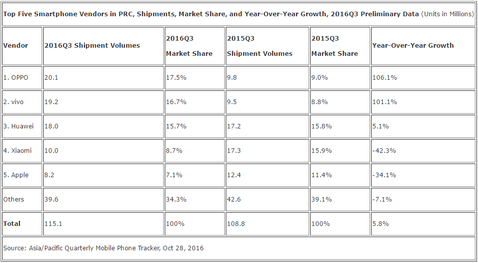 米国の調査会社であるIDCは26日(現地時間)、中国市場における2016年第3四半期(2016年7〜9月)のスマートフォン(スマホ)出荷台数のシェアを公表しました。公表された内容によると、中国市場におけるスマホ販売シェアは地元の新興企業「OPPO(オッポ、欧珀)」が17.5%と初めて首位に立っており、同じく地元の新興企業である「vivo(ビボ、維沃)」が16.7%と2位に続いています。