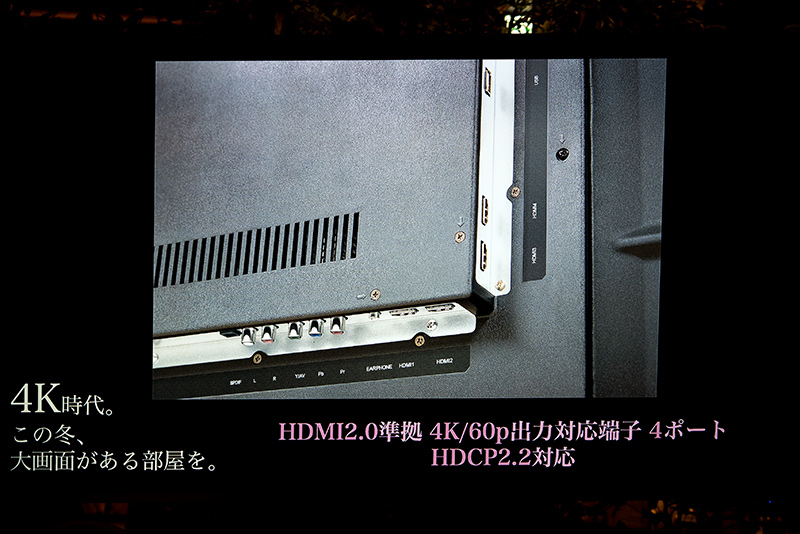 製品の特徴として広視野角のLG製IPS液晶を採用し、4k60fpsに対応するHDMI2.0準拠のHDMI端子を4ポート搭載する。4Kの視聴距離は1.5mと言われているので6畳の部屋に置いても十分綺麗な映像が楽しめる。