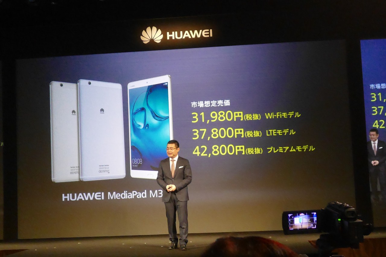 高い画素密度を誇る2Kディスプレイや優れたオーディオ再生能力を有するMediaPad M3。モデルによって価格は異なっており、市場想定売価は税込ではスタンダードモデルのWi-Fiモデルが34,538円、LTEモデルが40,824円、そしてプレミアムモデルは46,224円となっています。