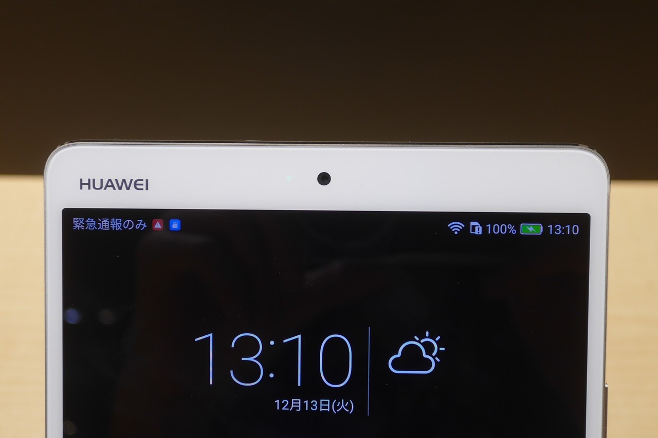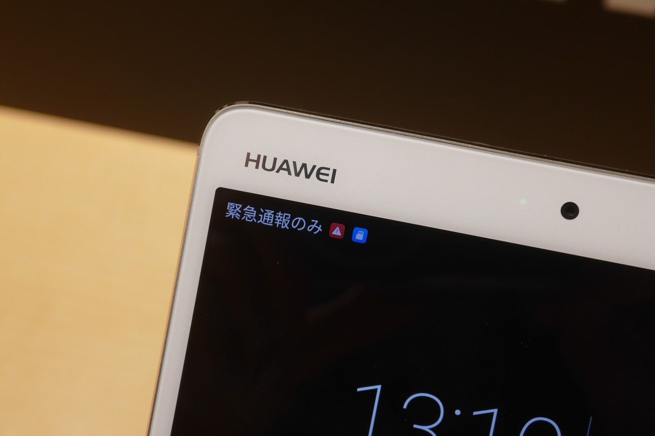 本体前面上部には約800万画素フロントカメラや通知LEDを搭載。左上には「HUAWEI」のロゴが印字されており、同製品のデザイン的なアクセントとなっています。ファーウェイ製品で企業ロゴが左上に配置されていることは珍しいですが、個人的には非常に好みです。