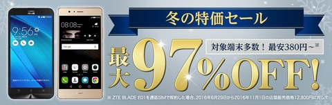 期間は2017年1月20日(金)15時00分から2月1日(水)9時59分まで。対象機種は「HUAWEI P9 lite」および「honor8」、「arrows M03」、「arrows RM02・M02」、「AQUOS mini SH-M03」、「AQUOS SH-RM02(32GBストレージモデル)」、「ZenFone 3 ZE520KL」、「ZenFone 2 Laser ZE500KL(16GBストレージモデル)」、「ZenFone 2 ZE551ML(2GB RAM・32GBストレージモデル」、「ZenFone Go」、「BLADE E01」、「MediaPad T1 7.0 LTE」の合計12機種で最大97%OFFになっています。