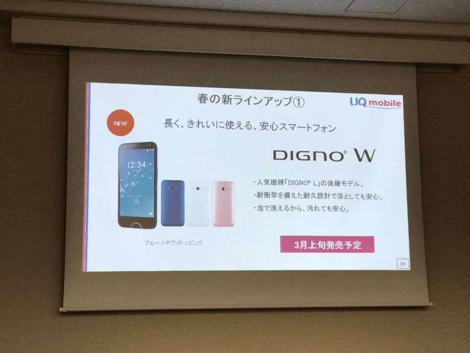 新製品はスマートフォン(スマホ)では泡ボディーソープでも洗える「DIGNO W」(京セラ製)およびミドルレンジ「BLADE V770」(ZTE製)、ケータイではUQ mobile初のau VoLTE対応「DIGNO Phone」(京セラ製)のほか、すでにauからも発表されているモバイルWi-Fiルーター「Speed Wi-Fi NEXT W04(型番:HWD35)」および据置型Wi-Fiルーター「Speed Wi-Fi HOME L01(型番:HWS31)」の合計5機種。