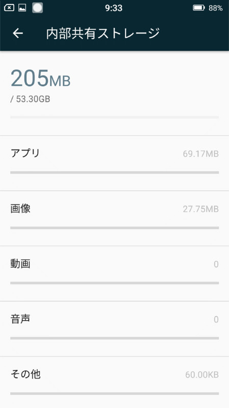 RAIJINのOSのバージョンはAndroid 7.0 Nougatをプリインストールし、購入時のセキュリティーパッチは2017年1月5日となっています。内蔵ストレージは約64GBでユーザーエリアは約53.3GBとかなり余裕があります。使い方にもよりますが、これだけの容量があれば、DSDS(デュアルSIMデュアルスタンバイ)機能で2枚のSIMカードを挿してmicroSDカードが使えない状態でも困る人は少ないのではないかと思われます。