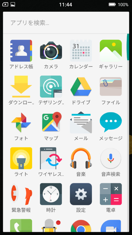 Android UIは慣れた人も多いであろうアプリ一覧を呼び出せるホーム画面となります。内蔵アプリの数は非常に少ないので、ホーム画面は1枚のみとなっています。