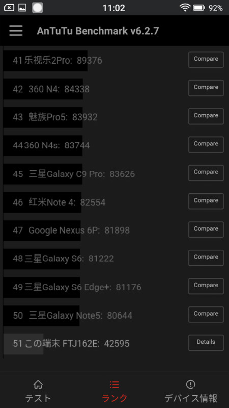 AnTuTu Benchmarkではスコア上位50機種を対象に詳細な比較ができますが、50位の製品(日本未発売のサムスン電子製「Galaxy Note5」)と比べてもスコアが離れすぎており、比較として適当ではないかと思います。