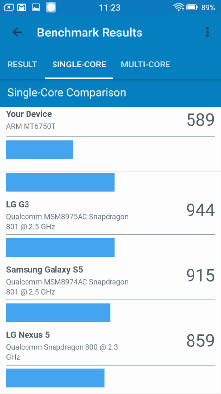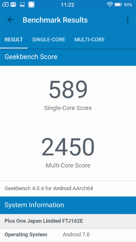 Geekbench 4におけるスコアはシングルコア性能が589、マルチコア性能が2450となりました。シングルスコア性能を他の端末との比較で見るとかなり低いことがわかります。比較製品の一番下にあったGoogleのリファレンスモデル「Nexus 5X」よりも非常に低く、シングルコア性能だけで見た場合はかなり厳しい数値ではないかと思われます。