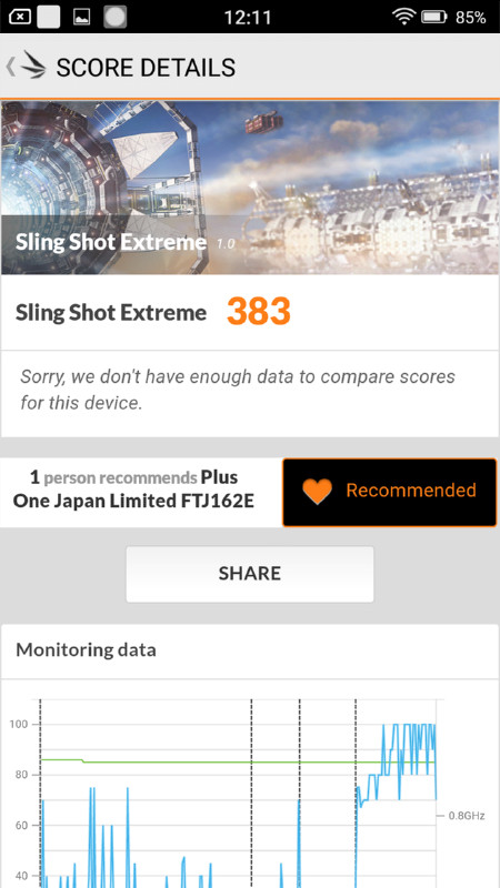 上位勢は2500前後から3000超え(最上位のNvidia Shieldは4000に迫るスコアだが据え置き機なので、ここでは除外)に対し、RAIJINのスコアは383でかなり低めです。ベンチマーク中もPC Markの時とは異なり動作が重く、コマ送りに近い状態で動作していました。